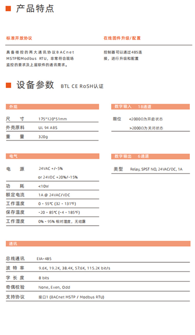 支持标准的BACnet MSTP和Modbus RTU两大开放性通讯协议,采集现场各种开关量和模拟量的信号接入系统中。